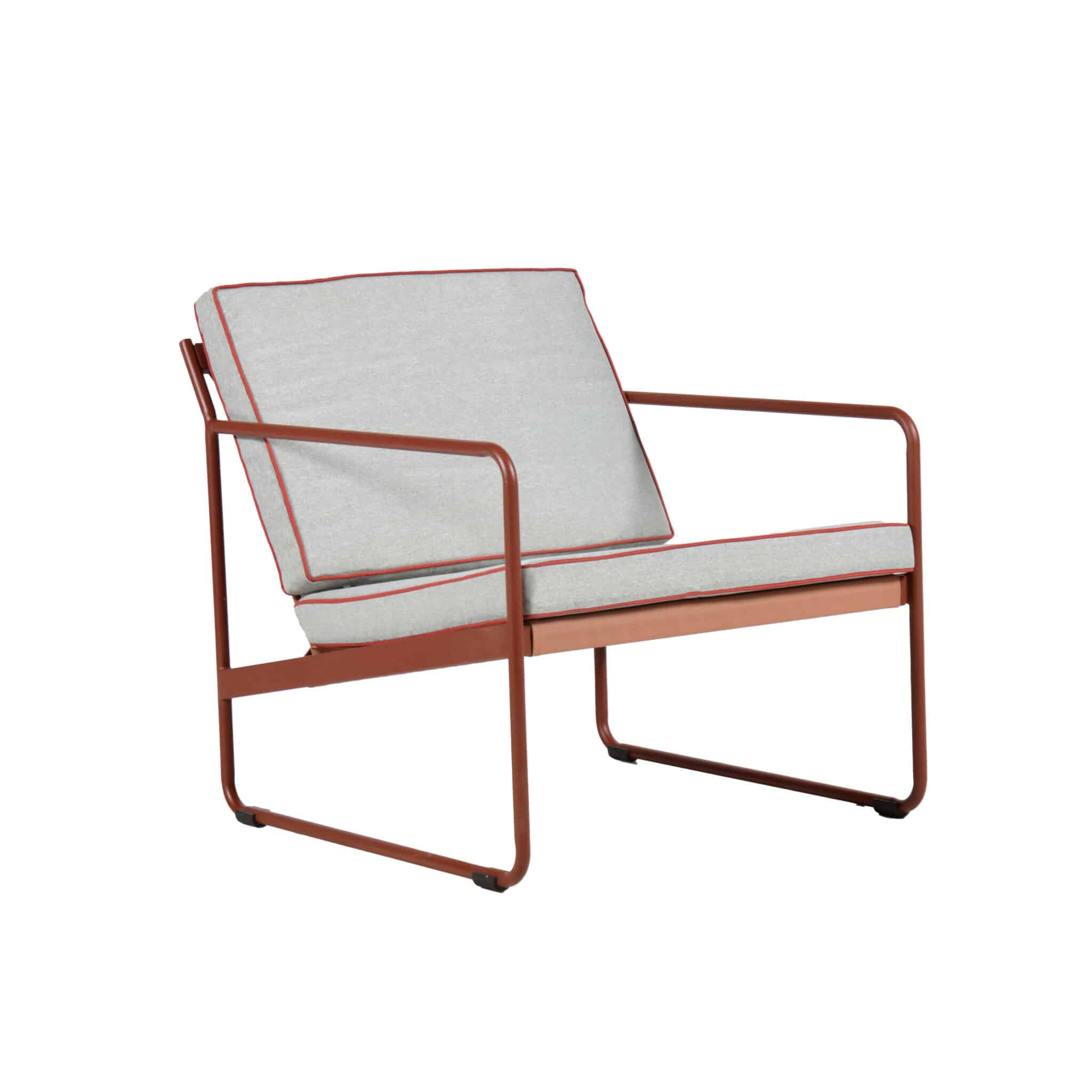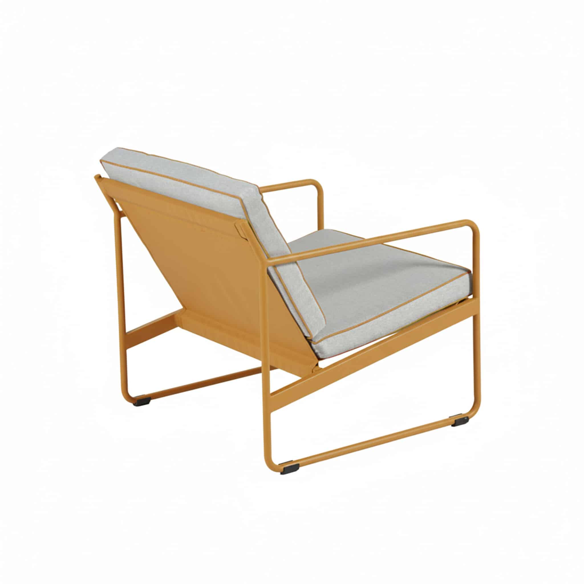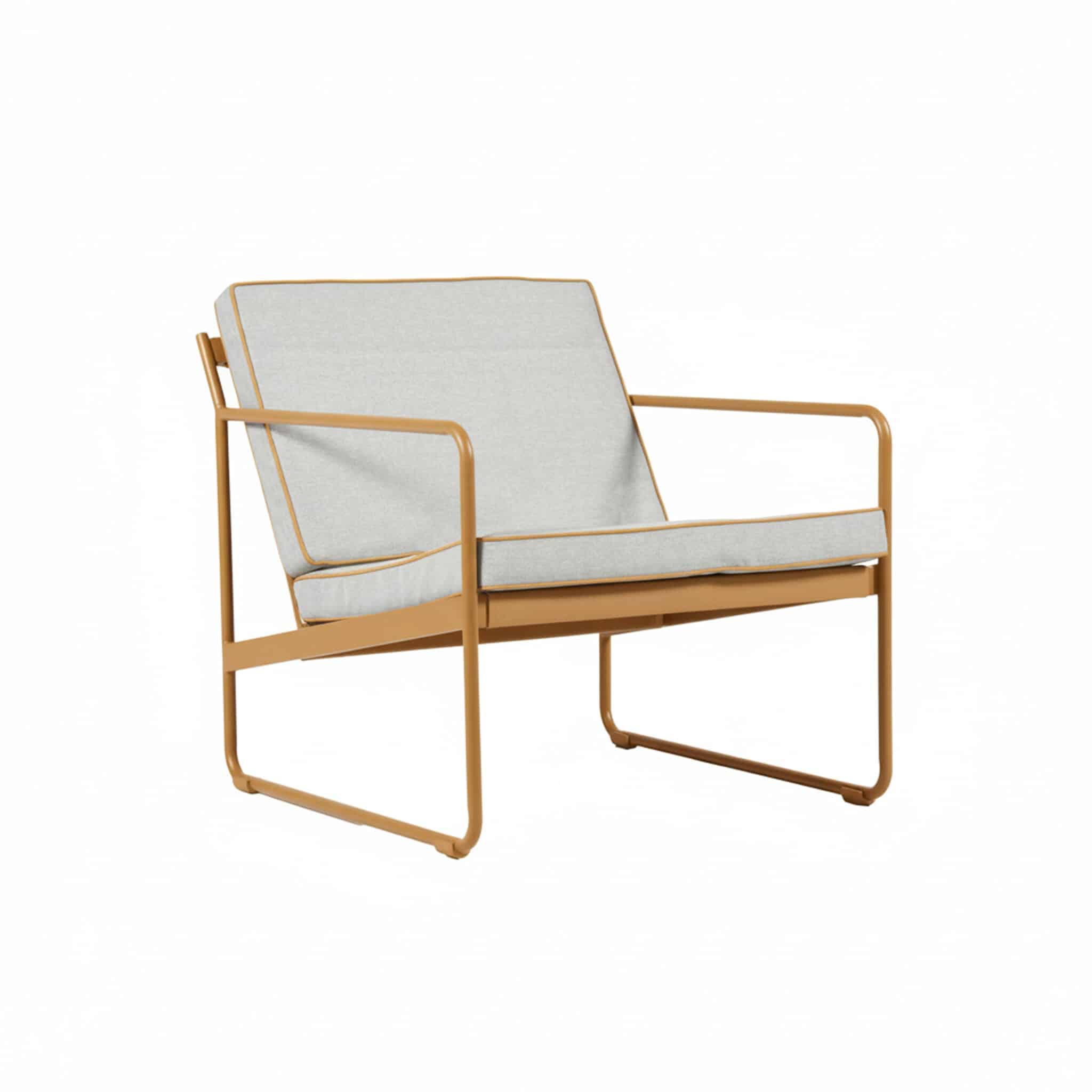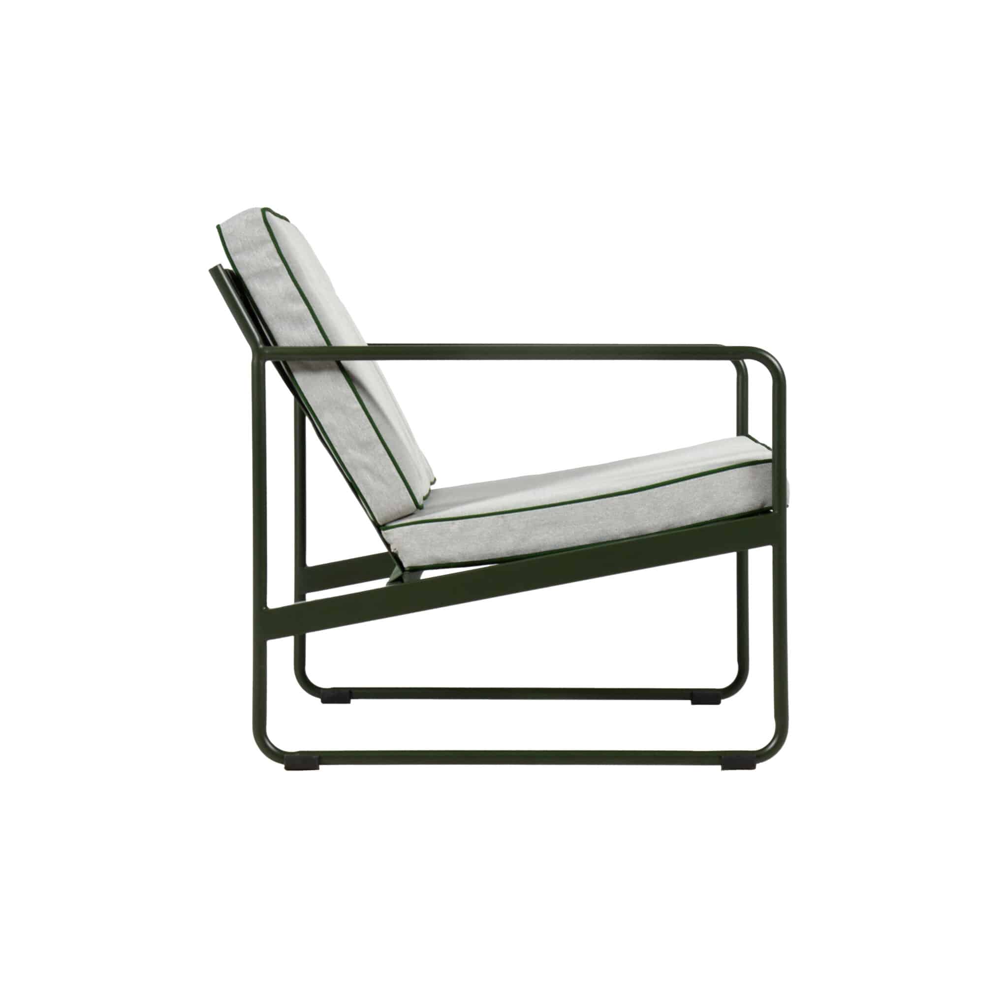 This compact outdoor lounge chair combines a sleek galvanized-steel frame with a durable textilene seat, offering both strength and modern elegance. Delivered flat-packed with a hidden-screw assembly system, it ensures a clean, seamless look once built. The seat and back cushions feature a refined contrasting piping that adds a touch of sophistication.
